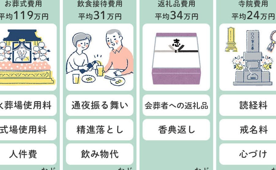 葬儀費用、墓地費用、葬儀場費用、祭壇費用、供物費用などがあります。