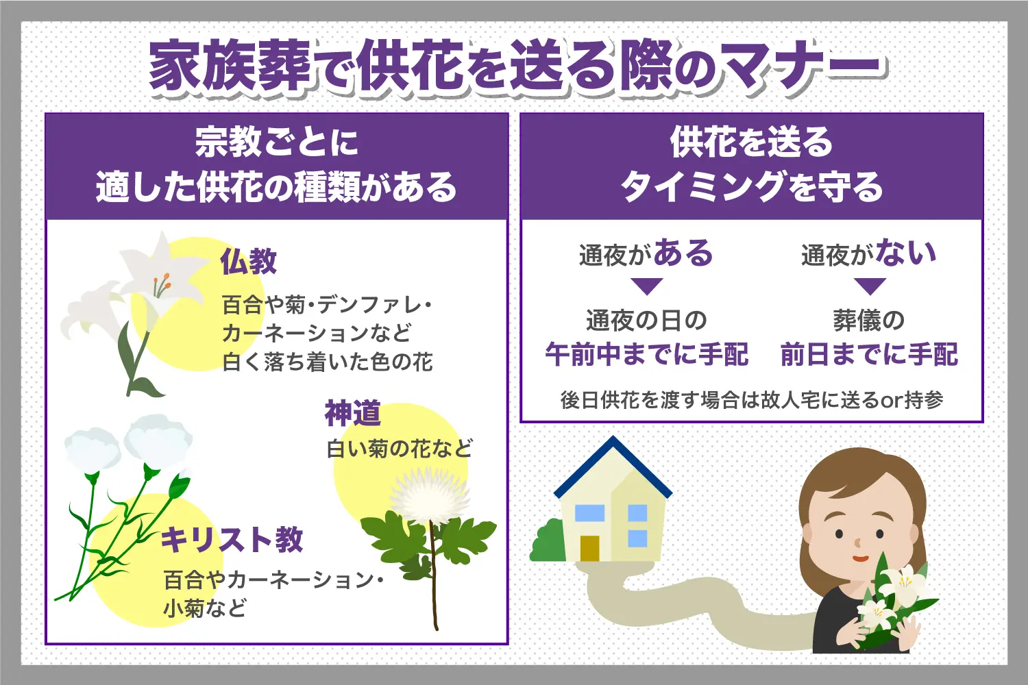 - 宗教に応じて花を供える作法を決める